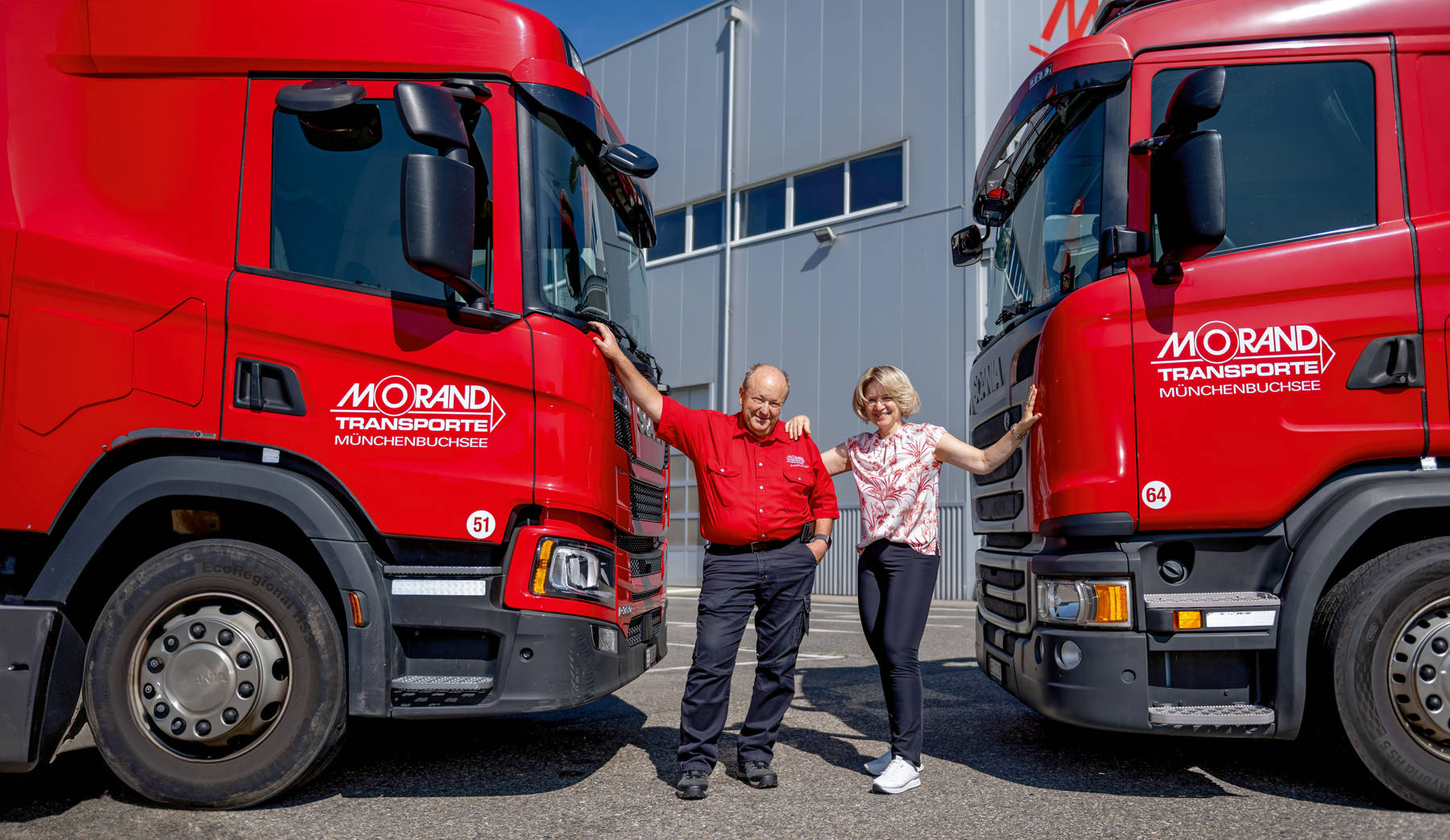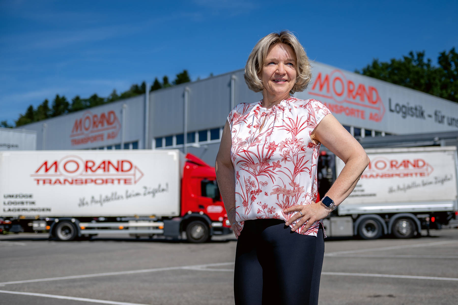 Auch im Transport vermag die Morand-Crew einiges zu bewegen. Täglich sind 14 Fahrzeuge in der ganzen Schweiz unterwegs. Vom Stückgut über die Kaffeemaschine bis zu wieder verwertbaren Reinigungstüchern wird alles transportiert. Zu den Umzügen ergänzen sich die Transporte und die Logistik zu einer idealen, rentablen Mischung, damit die Mitarbeitenden, die Fahrzeuge und die Infrastruktur der Morand Transporte AG maximal ausgelastet sind. « In der heutigen Zeit verdient ein Chauffeur, der den ganzen Tag auf der Strasse unterwegs ist, der Stauzeiten aushalten und das Drängeln vieler anderer Verkehrsteilnehmer aushalten muss, grossen Respekt », sagt Brigitte Morand.